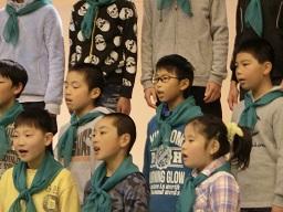 小学校の発表が終わり、休憩になりました。この時間を利用して合唱部のみんなはスカーフの準備をしました。