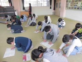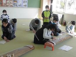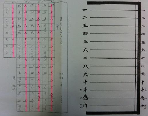 琴を弾く前に、6年生が正座をして紙を見て練習しています。これは下のような琴の楽譜を見て、練習しているのです。