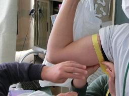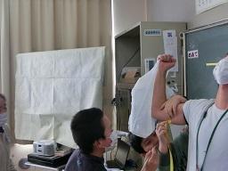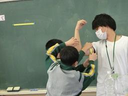 先生の曲げた腕を紙テープで巻いています。