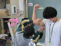 二人組になって、お互いの腕の太さをテープに写し取って測ります。