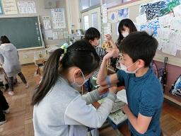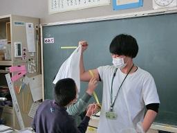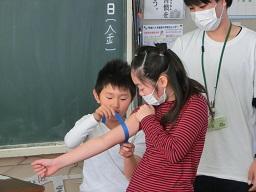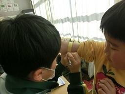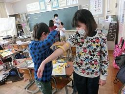同じように腕の太さを測っています。今日の勉強のめあては「なんでうでがふくらむのだろう」です。