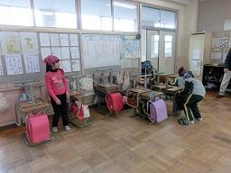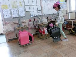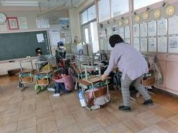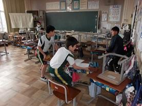ここは5年生教室です。ここも早く来た子が机やいすを寄せています。
