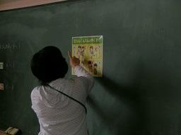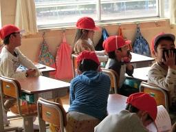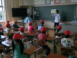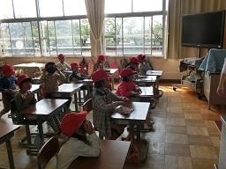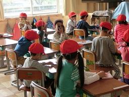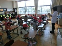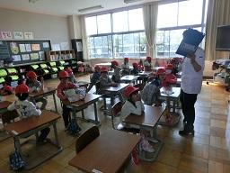 教室では訓練の前に、担任の先生が指導をしています。ここは1年生の教室です。