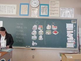 法人税、消費税、所得税、固定資産税、相続税、印税、難しい言葉が並びました。黒板では税金で作られるものと、