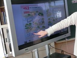 電子黒板に英語の教科書が写っていますが、そのアルファベットを先生が指さしました。