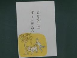 授業が始まりました。先生は、黒板に紙を貼りました。「犬も歩けばぼうに当たる」と書いてあります。「どういう、意味かな。」