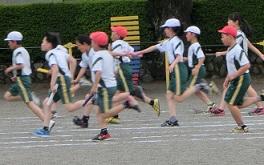 学年別に練習していました。上の写真は5年生の練習風景です。後ろを見ないでバトンを渡すことができたグループです。