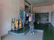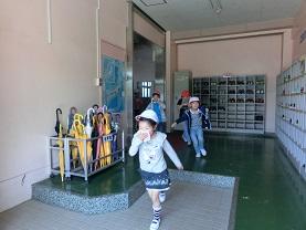 先週の木曜日のことです。1年生が学校探検をしました。2年生が手を引いて案内役です。
