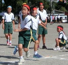 バトンは3年生から4年生渡る場面です。黄色が1位です。