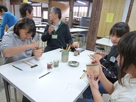今度は陶器の絵付けをやります。最初にお店の人がやり方と見本を見せてくれました。
