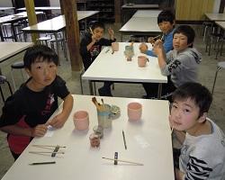 湯飲みの茶碗に絵付けをします。筆も絵の具も専用の物を使います。