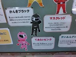 「健康戦隊 かぜにまけないんジャー」の紹介をします。①はえいようイエローです。「朝ご飯、昼ご飯、夜ご飯、赤・黄・緑のバランスのとれた食事でウィルスに負けない負けない強い体を作るぞ!」と言っています。②かんきブラックは「寒いからって窓を閉め切ってはダメだぞ。空気中にウィルスがうじゃうじゃいるぞ。換気をしてウィルスを追い出せ。」と言っています。