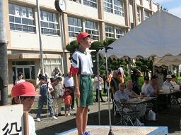 後ろでは団旗を持っている児童がいます。競技上の注意を言っているのはKH君です。