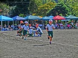 最初の種目は1,2年生のかけっこです。1年生が走ってきました。最初の組は白、次の組は赤が1位です。
