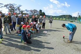 火山をモデルで紹介したのです。さて、スクールバスに乗って、見学に出かけました。