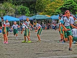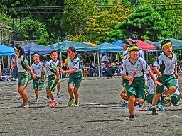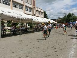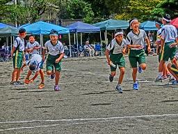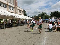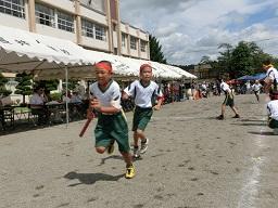 4年生の女子から男子にバトンが渡りました。上の右と左の写真は同じ場面を違うカメラで撮ったものです。