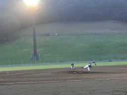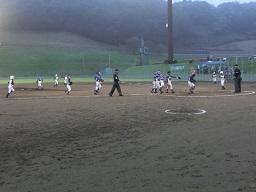 午後4時20分。照明に灯りは入りました。泉の攻撃の時です。これ以前の3回にはHK君のデッドボール、この走者1塁。次のWH君がサードとショートの間を強烈なライナーのヒットを放ち、レフトがエラーをする間にWK君は3塁へ。そして打点1です。この3塁ランナーを8番バッターTY君がスクイズを決めて、もう1点追加です。これで7対0です。
