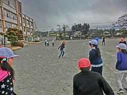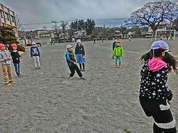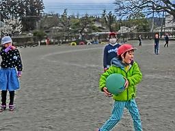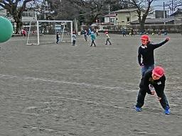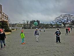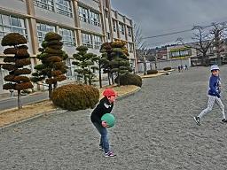 3年生が朝礼台の近くでドッジボールをやっていました。