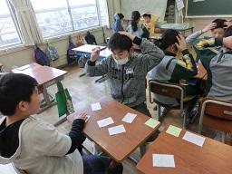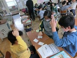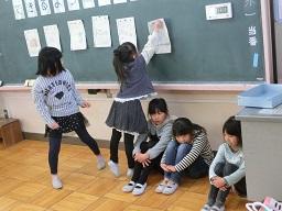 大きな紙を机の真ん中に広げて、調べたことわざをもとに問題を解いていきます。楽しそうにやっていますね。