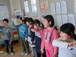 最初は手を頭の上に置いて待ちます。本校ではこうやって毎日英単語を覚えています。