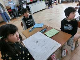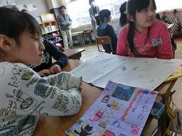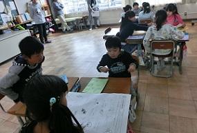絵と作文に書いたものを大型テレビに映して発表していました。5人が一グループですね。