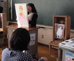今日の1時間目に6年生が青い目の人形の勉強をしました。社会の勉強です。最初に15分ほど紙芝居を読みました。