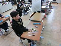 ペン、鉛筆、消しゴム、定規、はさみ、糊、筆箱が先生の机の上にも、子供たちの机の上にも用意されました。