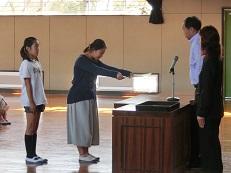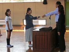 式が終わった後、表彰をしました。読書感想文の表彰です。まずは6年生のTOさんです。
