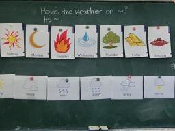 この日は天気を質問したり、答えたりする勉強です。曜日と天気は黒板に書いてありました。