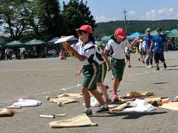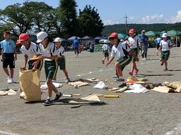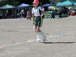 今日は4年生の競技場面をお届けします。袋に両足を入れてジャンプ。