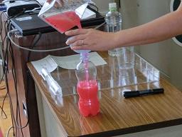 先生が色水を移し替えています。先生は「よく見てて」と話しました。上の青い文字をクリックすると動画が見られます。