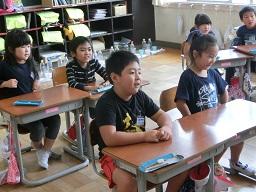 みんな良い姿勢ですね。今日は先生の机の上に色水があります。