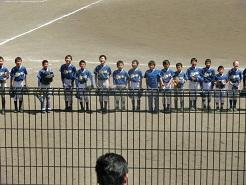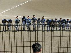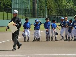審判がホームベース上をきれいにならしています。表彰の準備です。「さあ、並ぶぞ。」コーチが選手に声をかけます。
