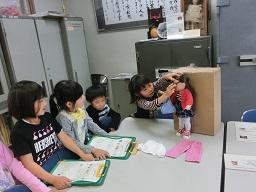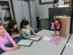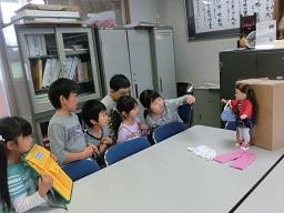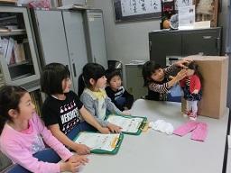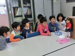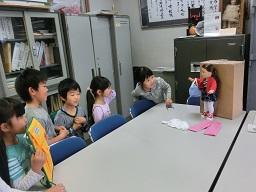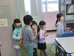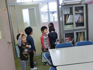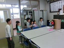 1,2年生の学校探検の続きを今日から再開します。「さようなら」とお人形に手を振っている1年生です。次のグループが来ました。