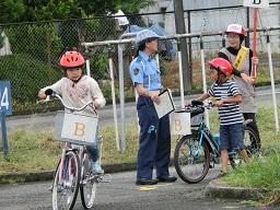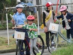 月曜日の3年生交通安全教室の3回目です。自転車にBと書いてあるのは、B班という意味です。