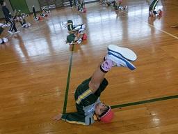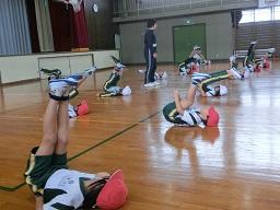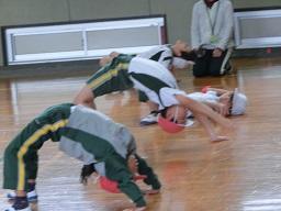 向こう側が2年生です。その次はブリッジです。体が柔らかい年代のうちにしっかりやっておきたい運動です。