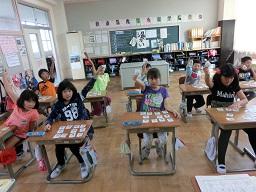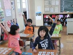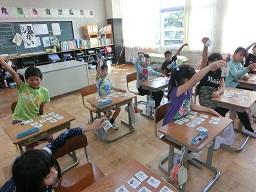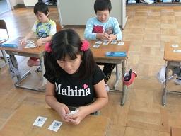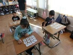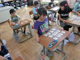 机の上に絵カードを並べ終わりました。さあ、問題が出ます。子ども達が手を挙げていますが、絵カードを持っています。
