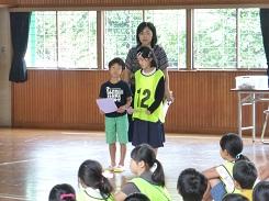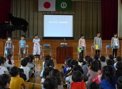 終業式の前に、各学年の代表児童からの1学期の生活についての発表と各種大会での表彰が行われました。代表児童による発表の内容は、1学期を振り返っての感想と2学期の目標についてでしたが、それぞれが落ち着いて堂々とした発表をしました。