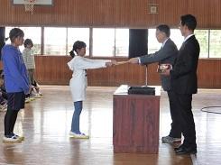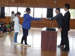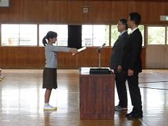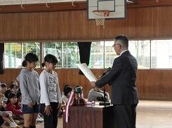 朝のあいさつの後、表彰を受ける児童15名の氏名が呼び上げられ、代表で6年児童が村上教育長様から表彰状を受け取りました。