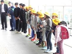 10月13日の朝、片岡駅で片岡地区コミュニティー推進協議会が「あいさつで 築こう人の和 地域の輪」の啓発運動として行ったあいさつ運動推進キャンペーンに児童が参加しました。