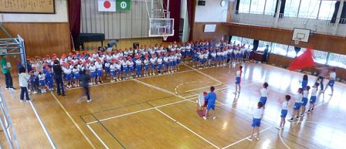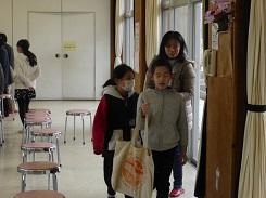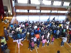 給食後に帰りの会をして、その後、1年生から5年生までが体育館に自分の椅子を運びました。