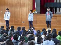 別れの言葉は、、卒業生が自分たちの思い出を振り返る言葉、在校生が卒業生との思い出を振り返る言葉、そして卒業に際しての言葉という3つの内容に、合唱が2曲加わり20分を越えるものになっています。今まで各学級では練習をしていましたが、全体での練習になるので、言葉をつなげるタイミングを合わせたり、声の大きさをそろえたりする事が必要になってくるので、これから卒業式まで練習を重ねていきます。