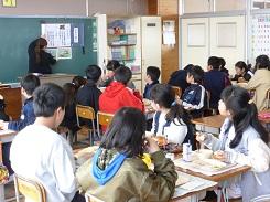 終業式の後は、お弁当でしたが、1年生の教室では、図書事務の先生やALTの先生と一緒にお弁当を食べました。