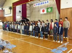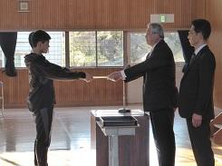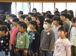 はじめに国歌斉唱を行った後、各学級の代表に修了証書と記念品が授与されました。その後、校長より「春休み中に一つ上の学年になるための準備をして、4月には新しい学年として登校することを待っています」という主旨の話があり、校歌斉唱をして修了式を終えました。