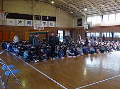 今回の児童集会は、はじめに「幸せなら手をたたこう」を全員で歌い、その後に◯✕クイズをしました。クイズの問題は片岡小学校の児童数や、片小ブランドについてでした。とても冷え込みが厳しい体育館での集会でしたが、正解に一喜一憂した児童達が可愛らしく、寒さが和らいだ気がしました。