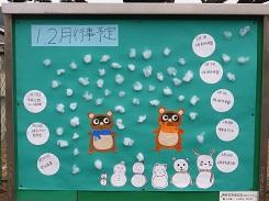 児童会の掲示委員会は、昇降口前にある掲示板に使用する毎月の行事予定を作成しています。12月はクリスマスツリーを題材にして作成してくれましたが、ここ数日冷え込みが厳しいので掲示板に霜がつき、掲示物の冬らしさを引き立てています。