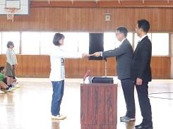 朝のあいさつの後、表彰を受ける児童15名の氏名が呼び上げられ、代表で6年児童が村上教育長様から表彰状を受け取りました。