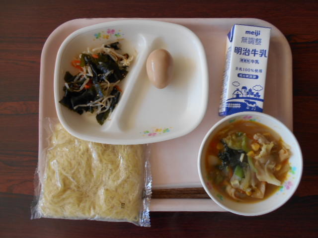 今日の一口メモは「ラーメン」についてです。ラーメンで使われている中華麺は、小麦粉から作られる、中国発祥の麺です。中華麺は、「かん水」というアルカリ性の水をつかって作られます。中華麺の黄色い色は、かん水を入れることによって、小麦粉に含まれるフラボノイド色素がアルカリ性になると黄色くなるためです。また、コシや独特の風味も、かん水による効果です。給食の味噌ラーメンは野菜をたくさんとれるように作っています。みなさんもおうちでラーメンを作るときは、野菜をたくさん入れて食べて欲しいと思います。