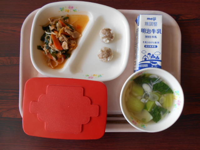 しゅうまい、ぶたキムチいため、チンゲンザイとホタテのスープ等です。