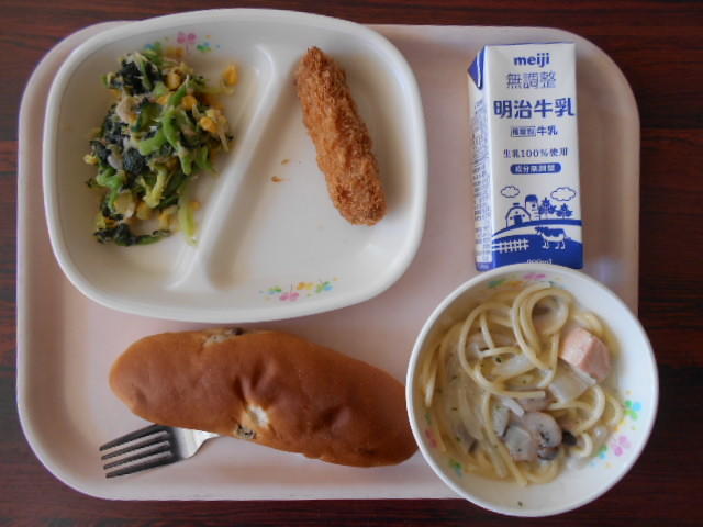ぶどうパン、さけのクリームスパゲティ、ハムカレーフライ、小松菜のサラダ等です。